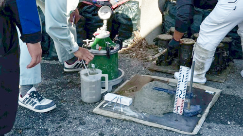現場では空気量やスランプ(柔らかさ)、コンクリートの温度などを測定し、