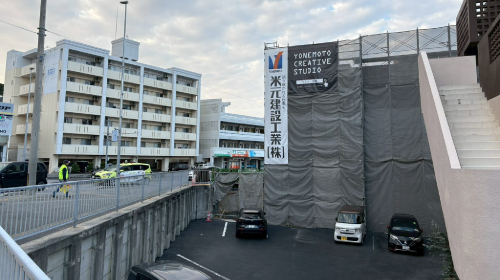 今日の現場レポートは足場ネットになびく弊社の看板にご注目下さい!